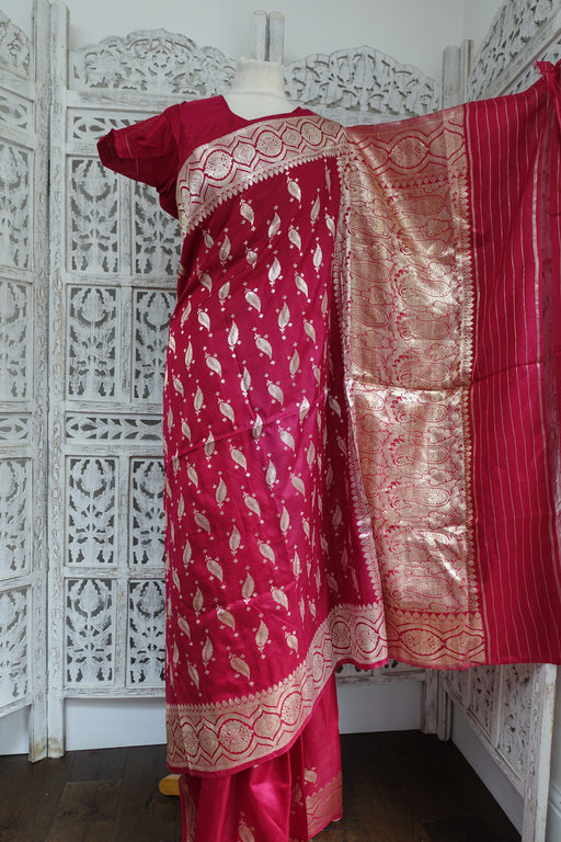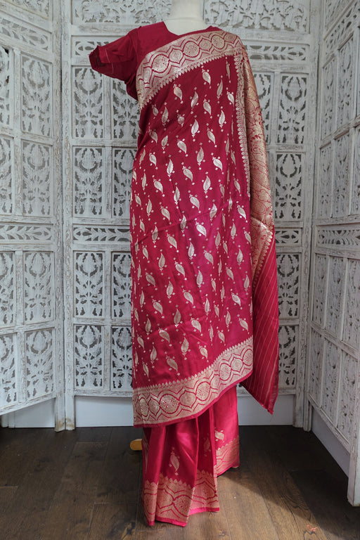 This is a vintage raspberry red silk blend sari, it has light gold zari thread work woven through it. It comes with a plain front fastening silk bl...