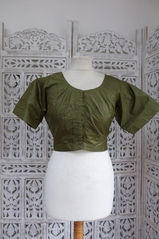 Plain olive green pure silk with a cotton lining and hook and eye fastening to the front, This will fit a 40” bust. Condition - New Measurements ta...