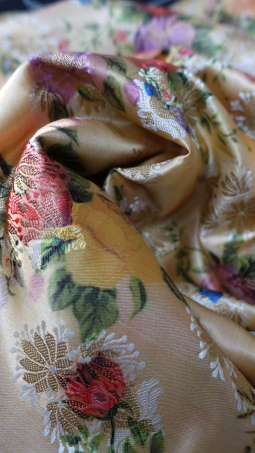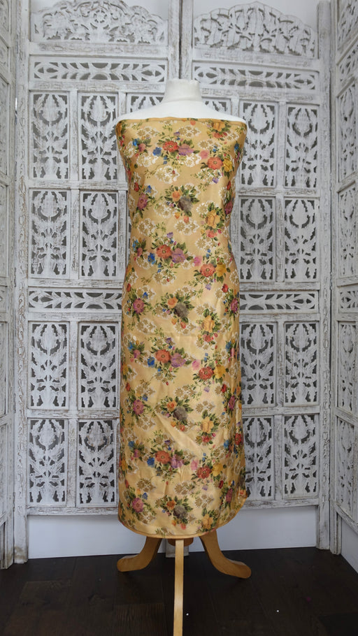 Description – This is an eye catching length of rich satin fabric in a rich gold colour with a floral design with gold thread woven through picking...