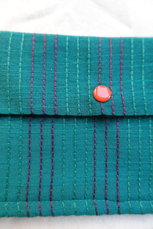 Colour : teal Fabric : silk Measurements : 11x21cm Description : this is made from a teal colour silk which has alternate coloured stitch work.
