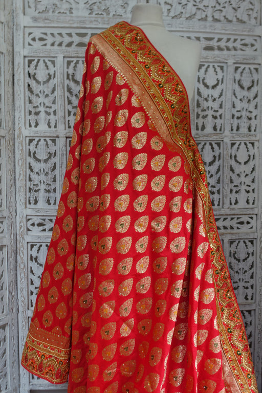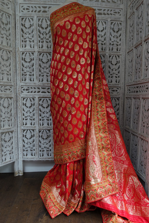 Bright Red Vintage Banarsi Woven Brocade Wedding Sari - New