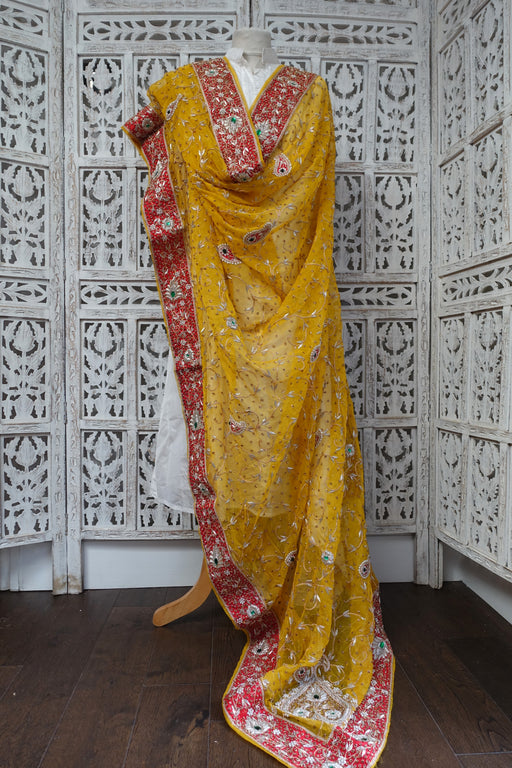 Description: This is a brand new unworn vintage red wedding sari made of American georgette, it is embroidered in a goldy yellow thread and finishe...