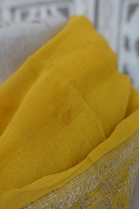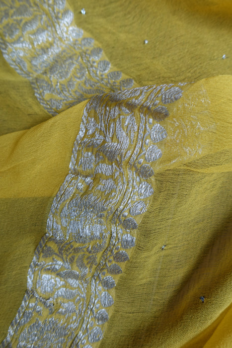 This is a lovely yellow chiffon banarsi dupatta, it has light silver metallic thread work and silver mukesh work.