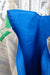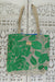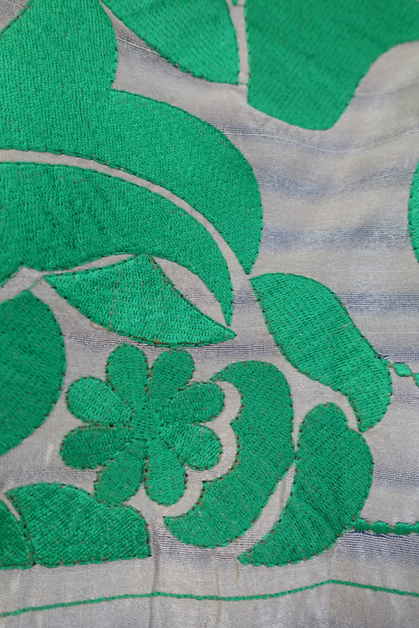 This is a sand coloured bag with the front having an emerald green embroidered panel.