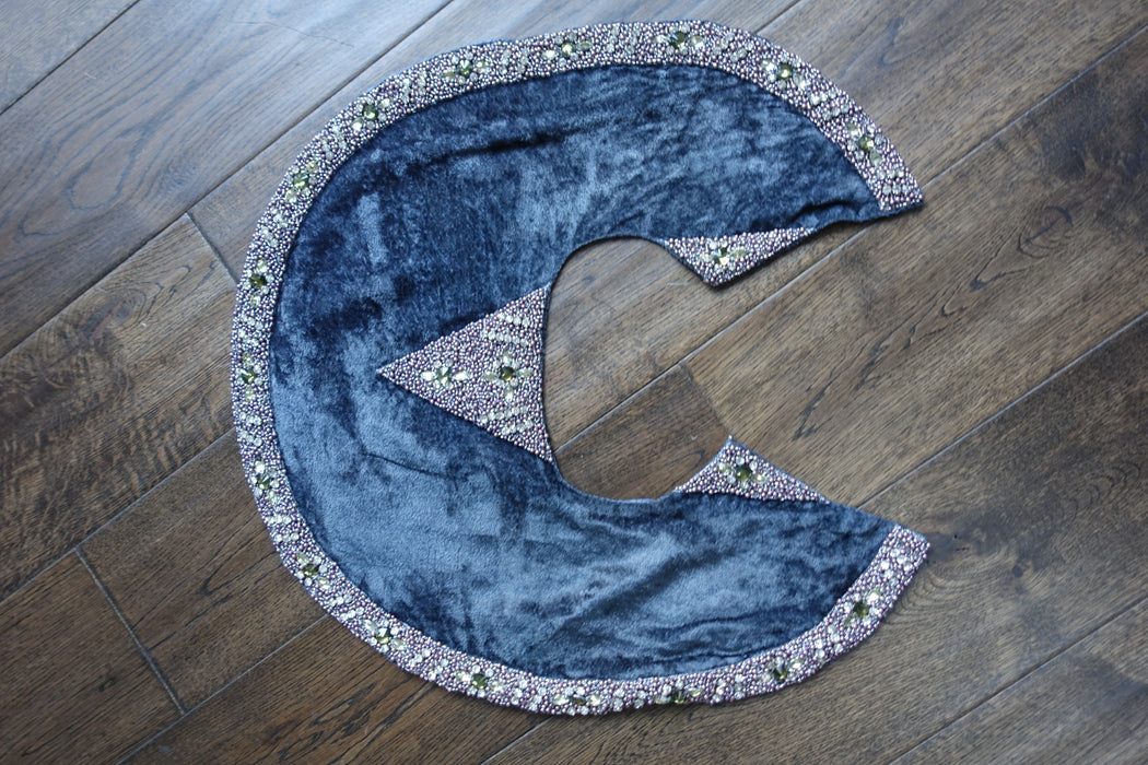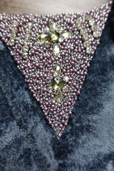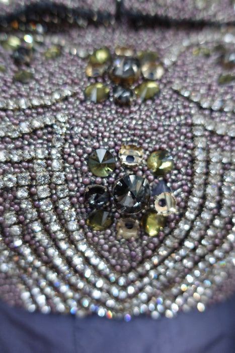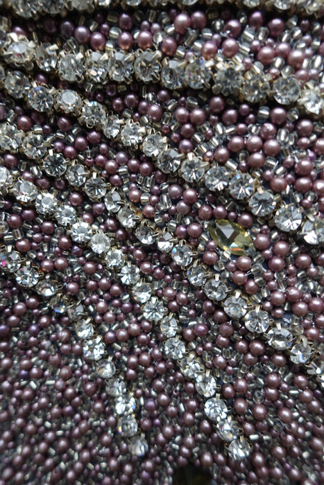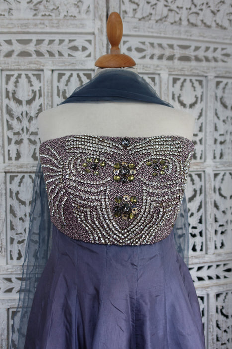 Kameez is a strapless top with a full panelled body, this uses a very soft silk that tends to fold in on itself as little. The fabric has some shading as it was displayed in the sunlight however it is not very obvious as it does fall into the folds, this applies to the kameez only. The upper part is very heavily embellished with lots of sparkling stones in different sizes as well as pearlised lilac coloured beads.