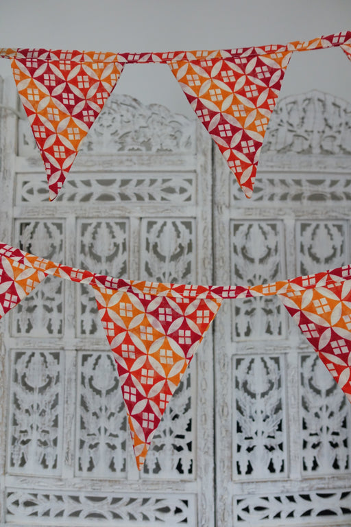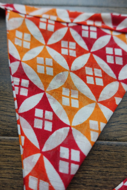 This bunting is made from a retro print cotton sari. It is printed in shades of red and orange against a white background.