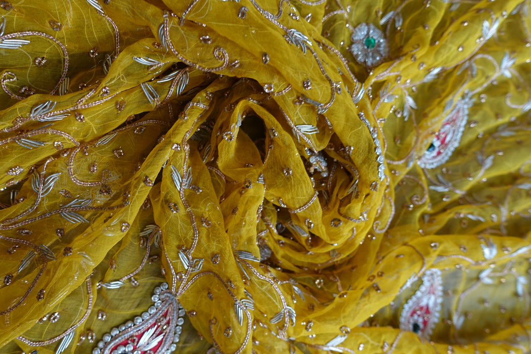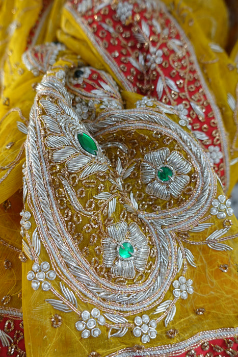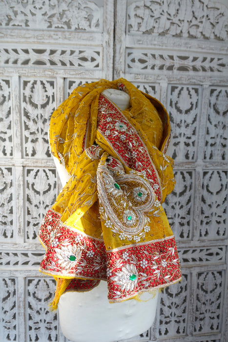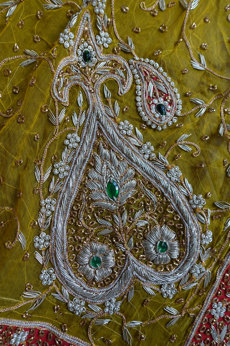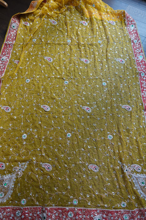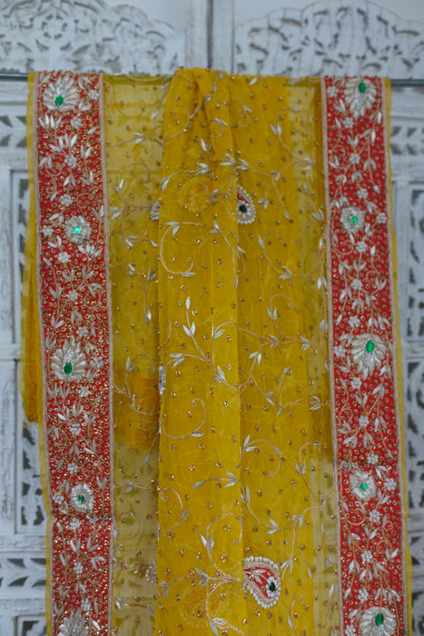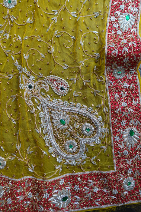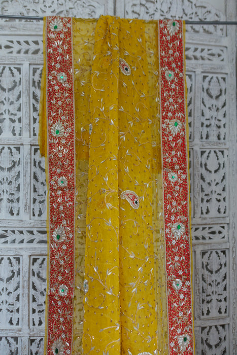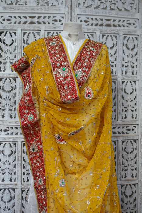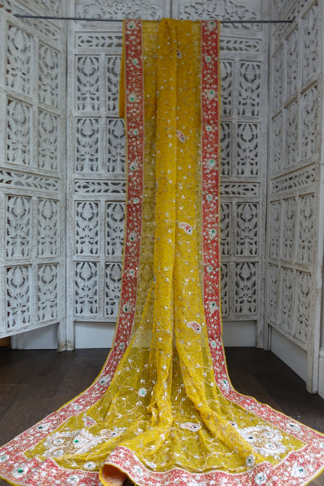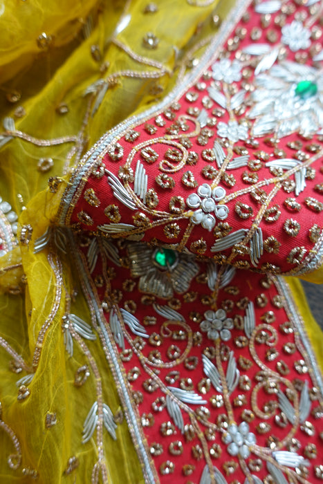 Description – Pure silk chiffon bright yellow with a wide red cotton trim around the outside. It has antique gold wirework, silver zardosi and small pearl details as well as colourful beads. The main body is similarly worked. This is around 30 years old, it has slight fraying with loose threads around the outer edges. This can be trimmed.