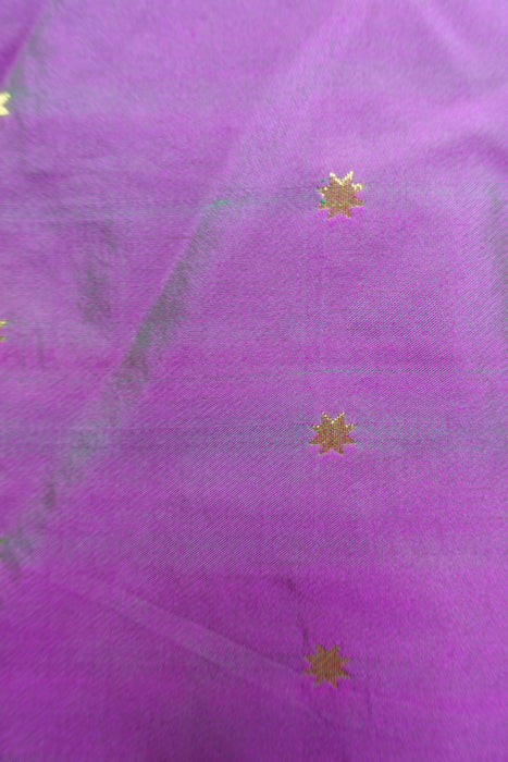 Description – this is a purple and green 2 tone silk blend with small gold star buta woven through the fabric.