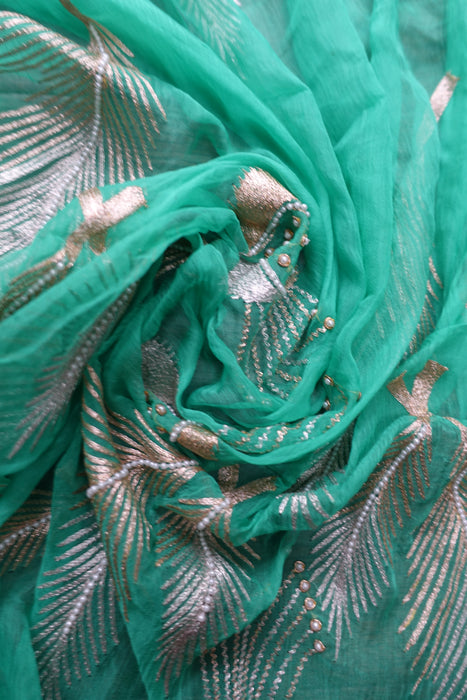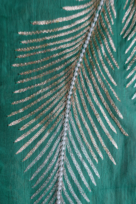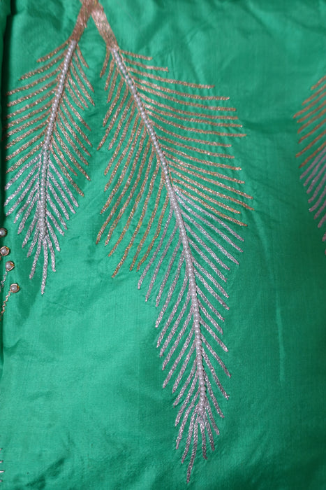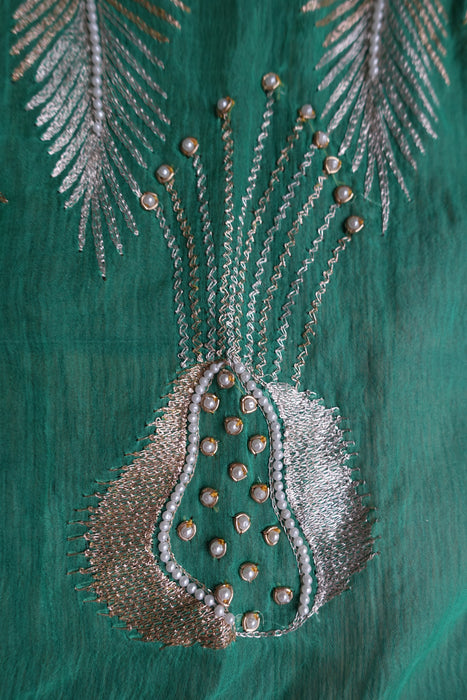 Description: this is a striking vintage bright green suit complete with matching dupatta. Embellishments include tilla work in both light gold and silver as well as fine zardosi and small pearl detailing.