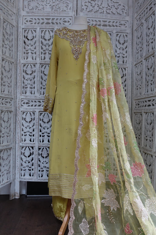 Kameez is made of a fine silk chiffon, it is embroidered and finished with tiny beads, the back is plain. Trousers are made of fine silk and are pl...