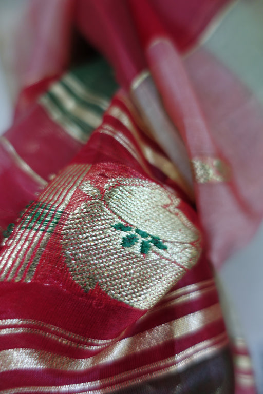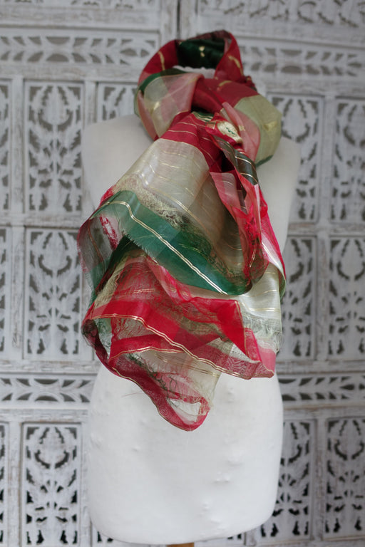 This is a red, green, cream and gold silk voile blend vintage shawl. It is unhemmed which is typical of these type of dupatta. It is around 30 y...