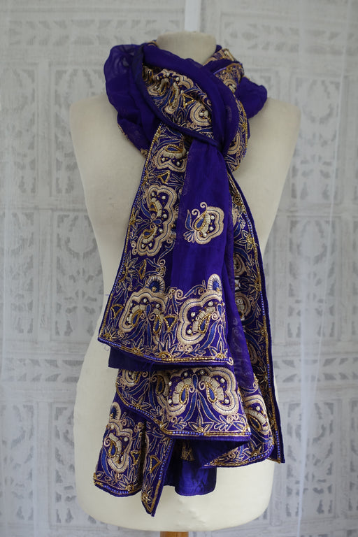 This is an art silk dupatta in shades of blue printed with raised gold block foiling. It is finished with a braid trim. It is brand new in very g...