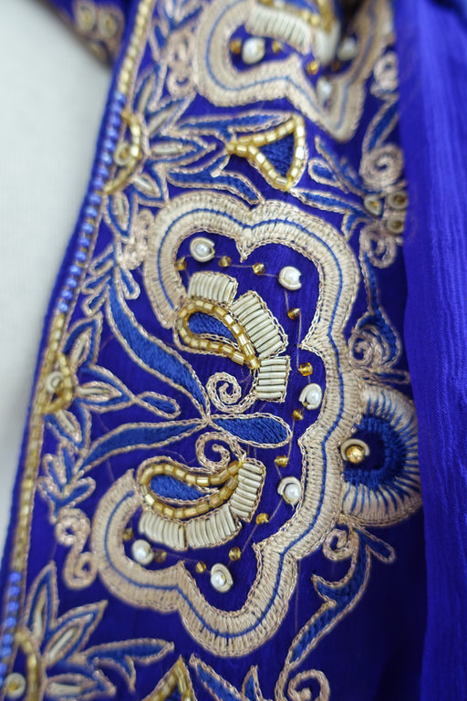 Pure silk chiffon with colourful embellishment worn included tilla and small beads in varying shapes and sizes. It has a gold braid trim finished w...