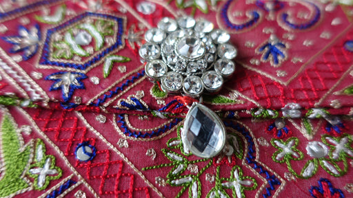 Colour : red Fabric : raw silk Measurements : 9 x 19.5cm Description : pure dark red raw silk with decorative diamante work.