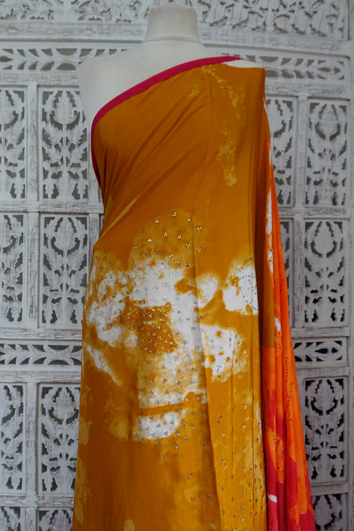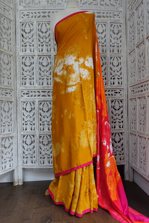 This is a really soft silk in shades of ochre and rich red. It has a contrasting bold floral print with the detailing picked out with little spar...