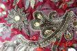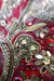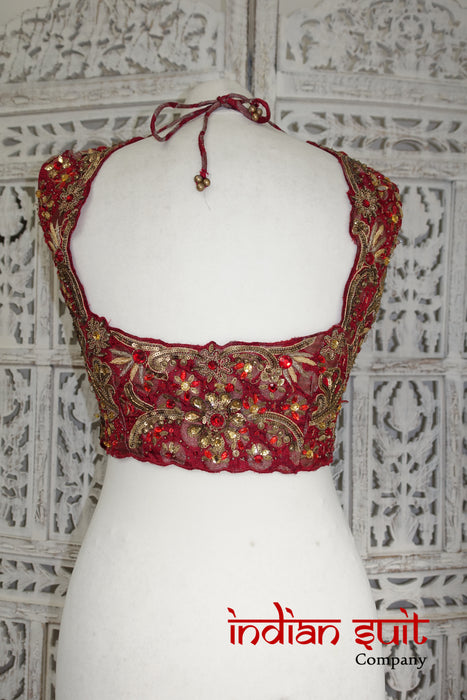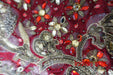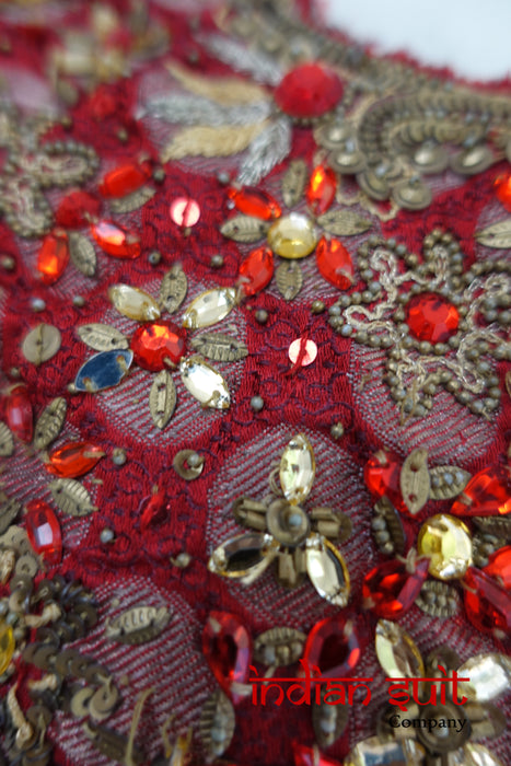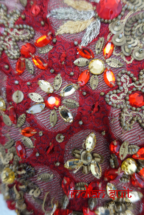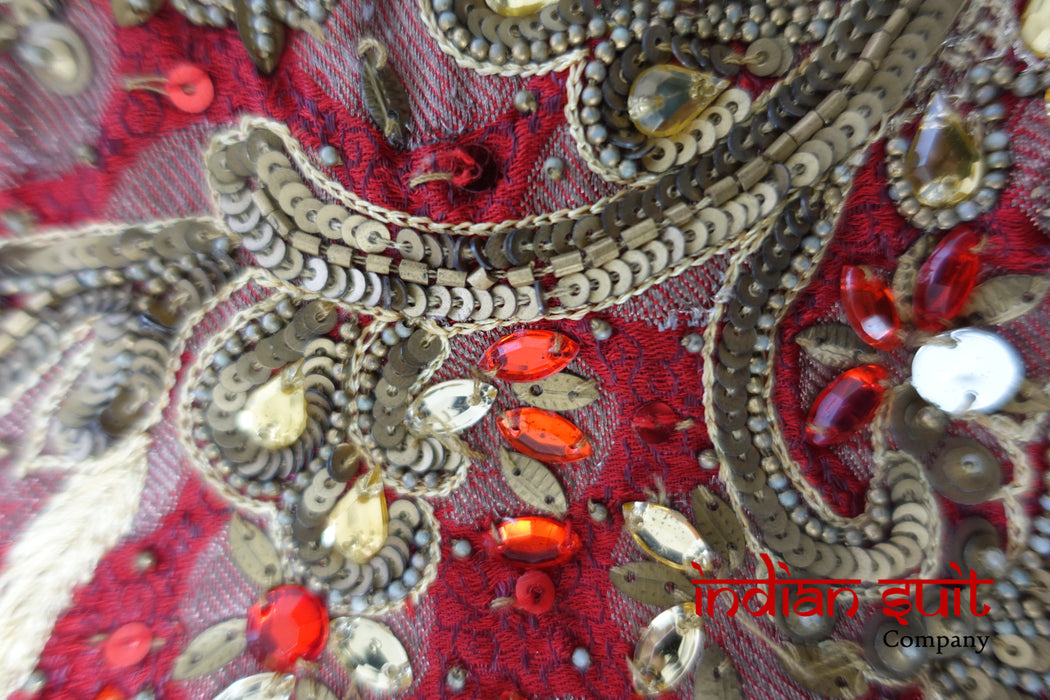 Dark red banarsi brocade is embellished with lots of beads, matt gold sequins as well as small beadwork,  It does have  some loose threads.