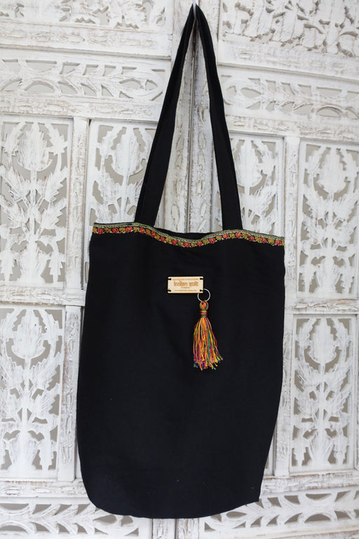 Black Cotton Linen Blend Antique Embellished Bag - New