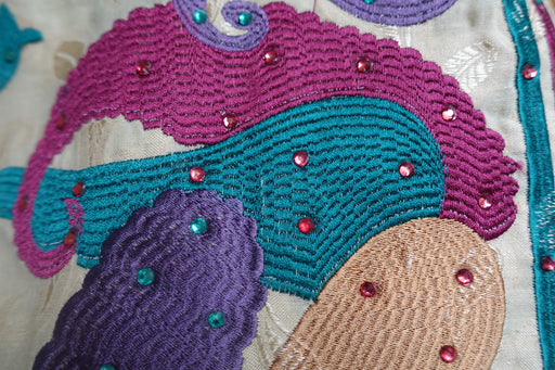 This is made of a lovely soft cream silk, it is embellished with masses of sparkling diamante stonework, maroon thread work, tiny beads and metalli...