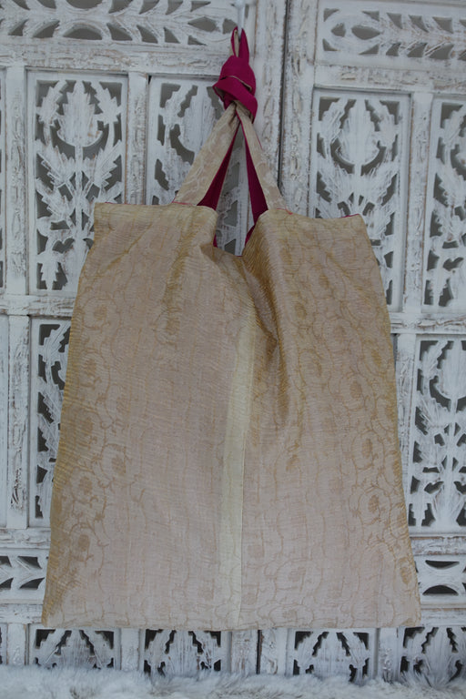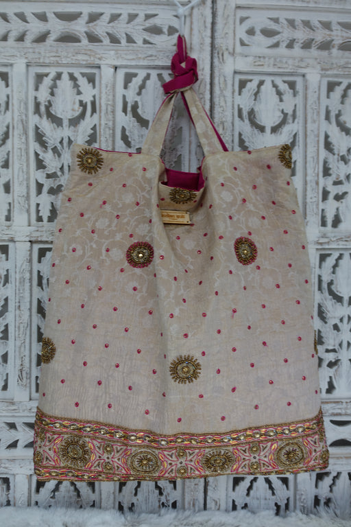 Cream Silk Embellished Bag With Plum Silk Lining - New