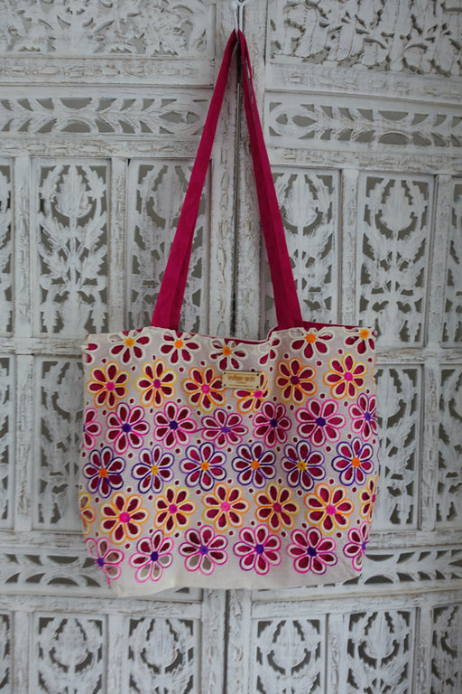 Cream cotton with colourful embroidered flowers cut worked, it is lined in pink cotton. Dimensions are: Handles – 86cm Width – 41cm Depth – 14cm He...