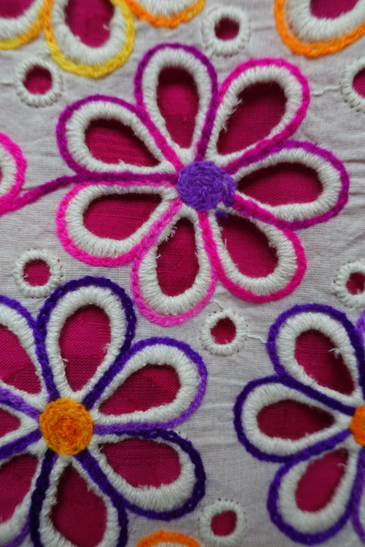 Description: Fabric – thin cream cotton embroidered in a floral design in pink, orange green and amber against as stone coloured background.  Hand ...