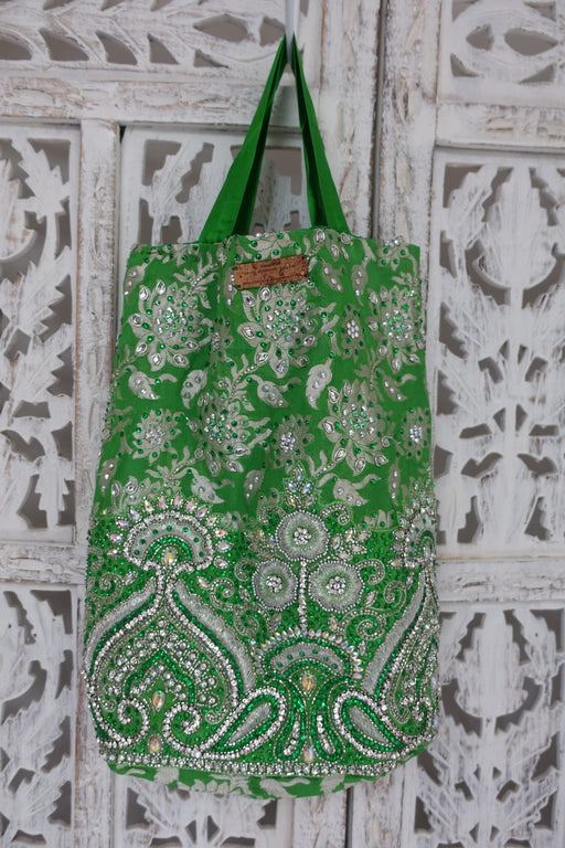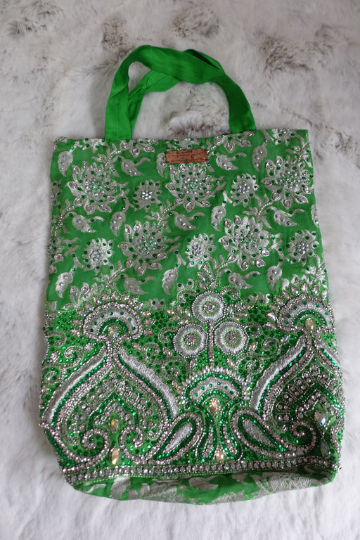 Bright Green Vintage Silk Zardosi Bag Cream Silk Lining - New