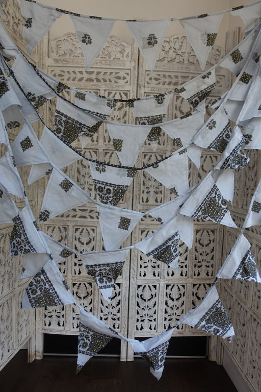 Grey thin cotton printed bunting sewn right side together measuring 17 cm across x 19cm. 14.6 metres with 72 flags