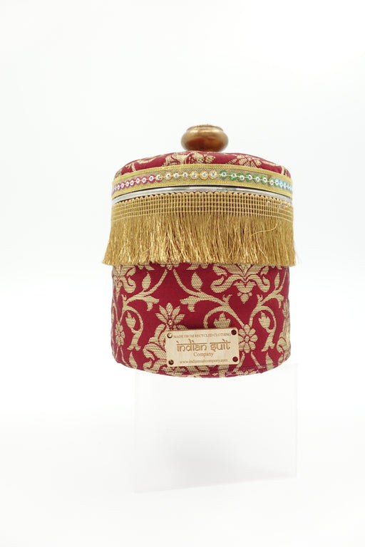 Description : - Steel tin covered in maroon and gold brocade, it is finished with a gold fringe and a gold handle. There are matching items availab...