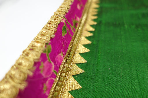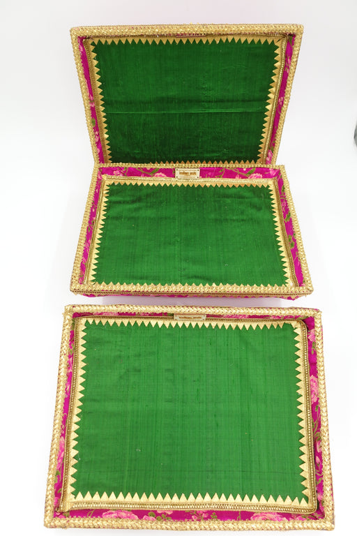 Description : - Wooden tray with a vintage floral pink raw silk outer and an emerald green raw silk inner. Finished with gold braid trims. 41cm acr...
