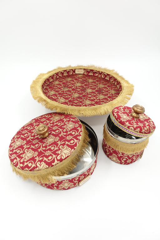 Description : - Steel tray with maroon and gold brocade , the outer edge is finished with a gold gota fringe. There are co-ordinating items availab...