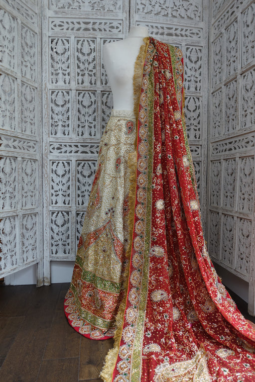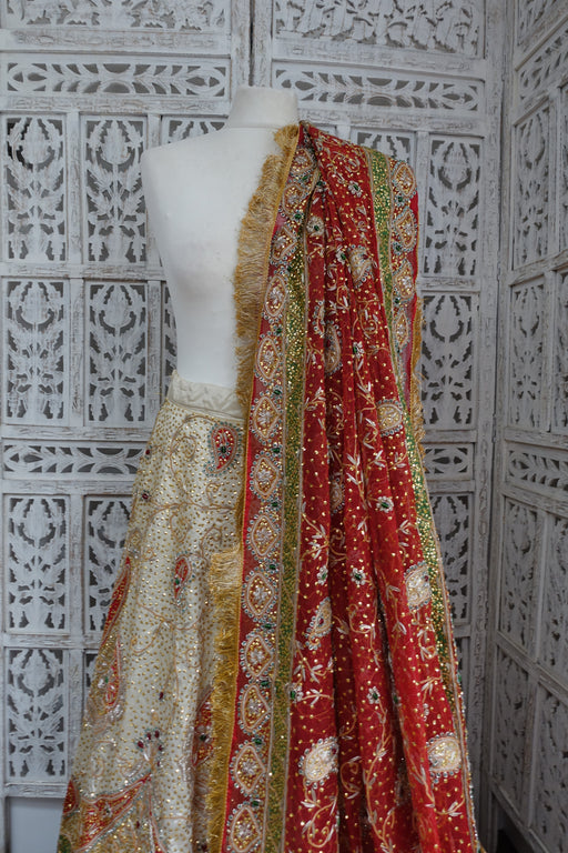Cream And Red Vintage Silk Lengha Skirt And Matching Dupatta - Preloved