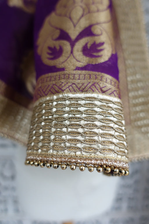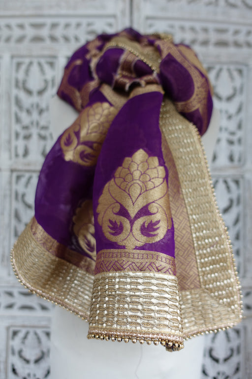 This is a purple banarsi style dupatta finished with a wide gold braid and beaded trim Fabric - chiffon Sze –  100 x  225 cm