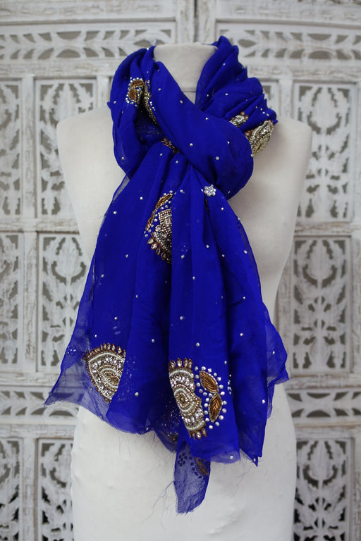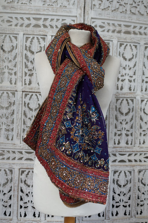 Crushed blue and vivid purple silk chiffon with woven edge trim, embellished with lots of mirrored sequins and beading. This is new in excellent c...