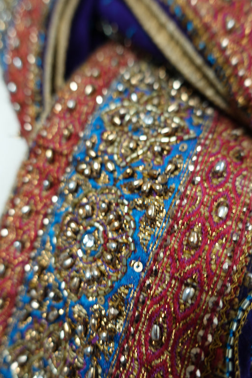 Crushed vivid purple silk, it has gold embroidery work beads, metallic tilla as well as gold hot dots. This is new in excellent condition. Outer ed...