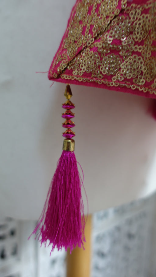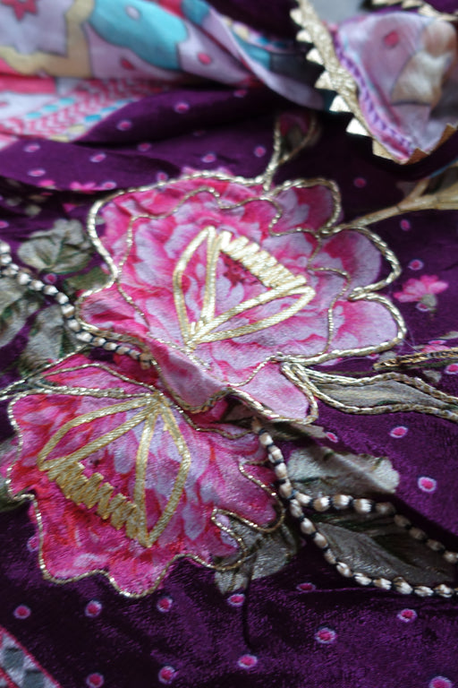 Crushed vivid purple silk, it has gold embroidery work beads, metallic tilla as well as gold hot dots. This is new in excellent condition. Outer ed...