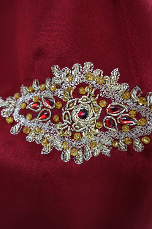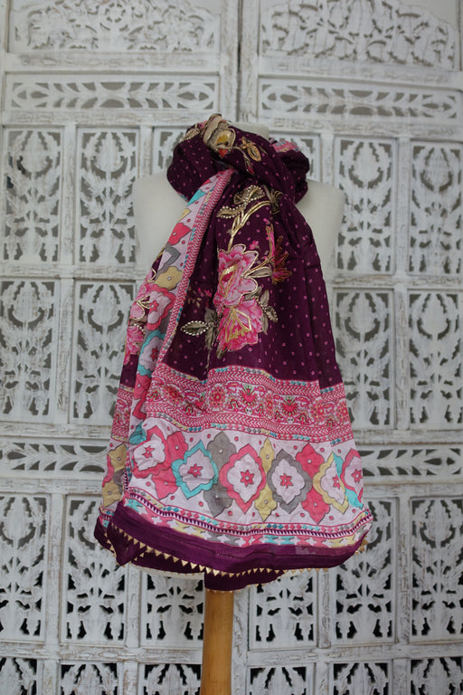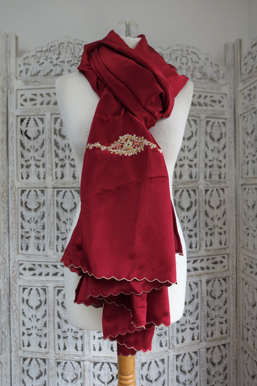 This is a large silky polyester crepe scarf embellished with delicate dhabka, sequins, beads and fine zardosi detailing.   The edges are finished ...
