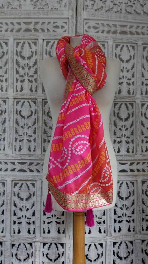 Pink Bandhani Dupatta With Gold Braid And Tassels - New