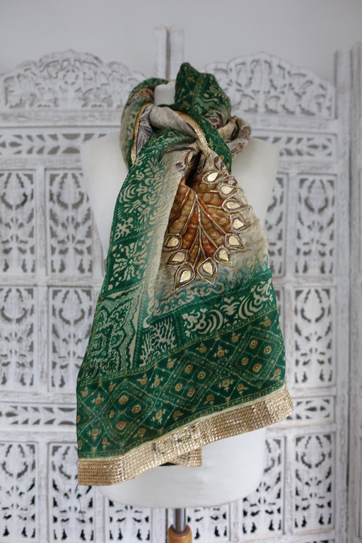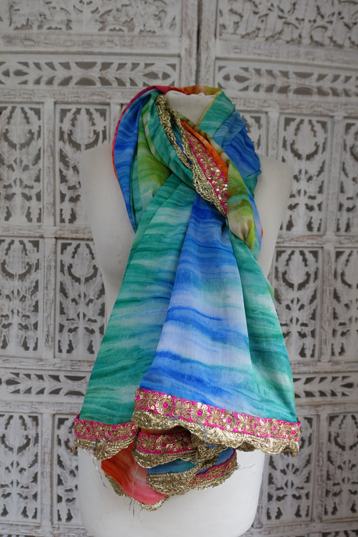 Description – this is a really silk vividly printed dupatta edges with rows of sparkling diamante stone work all around the outer edges. Measuremen...