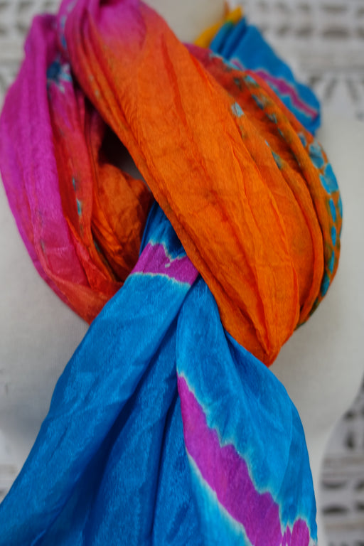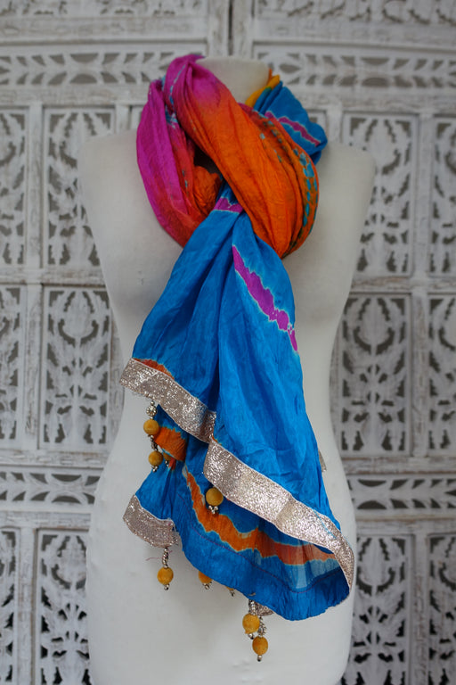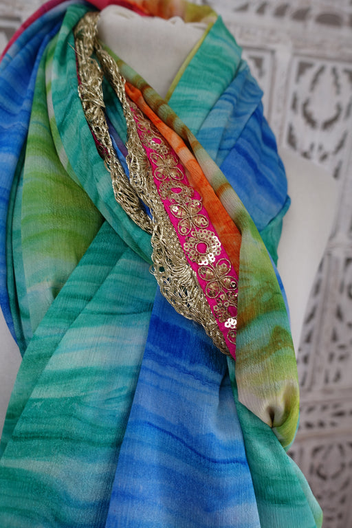 This is a colourful tie dye crepe dupatta finished with a gold braid trim and small ochre coloured ball beads. Size – 106 x 212cm