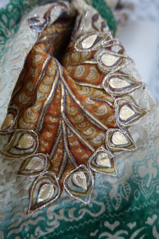This is made of a lovely silky crepe, it has an emerald green background with large blue dots and a floral design. This is embellished with lots of...