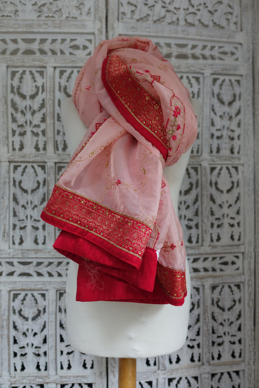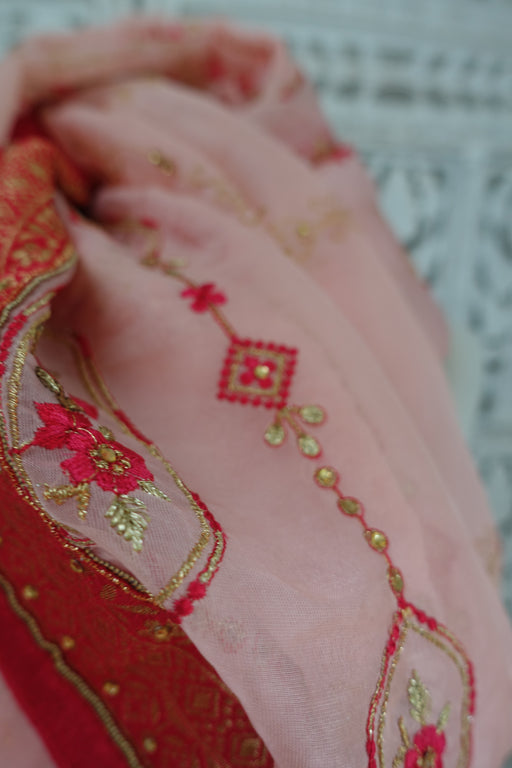 Product Detail – this is a large voile dupatta finished with a 6cm wide red and gold banarsi style brocade trim. It has small floral embroidery fi...
