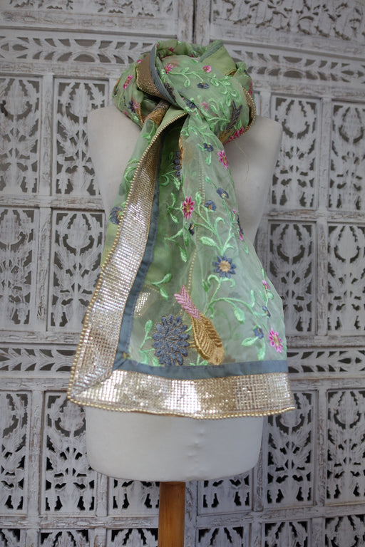 Light green mint with colourful embroidery work. Has a gold braid and beaded trim This is new in excellent condition. Size 68 x 241cm