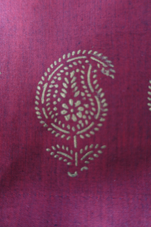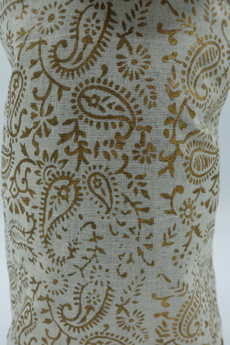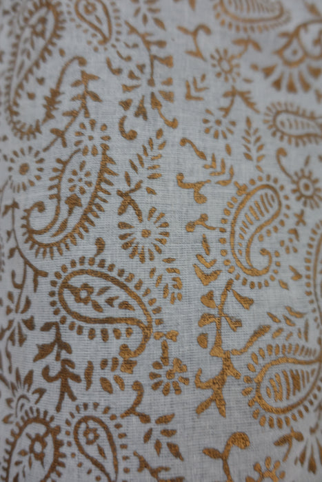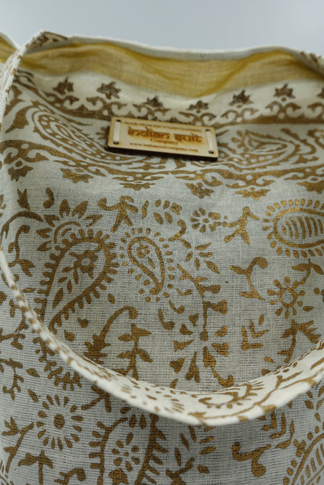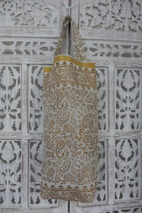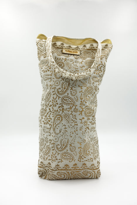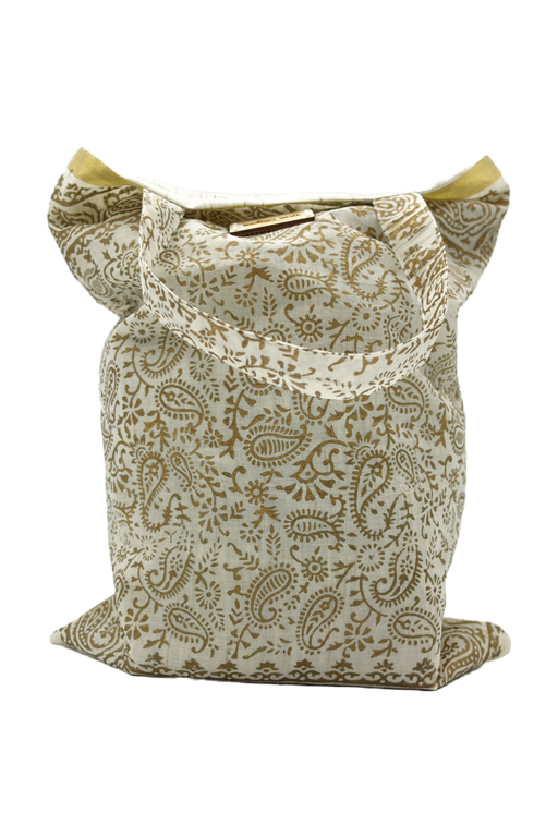 This is a fine gold block printed tote bag made of a thin cotton and lined in a plain thin matching cotton.