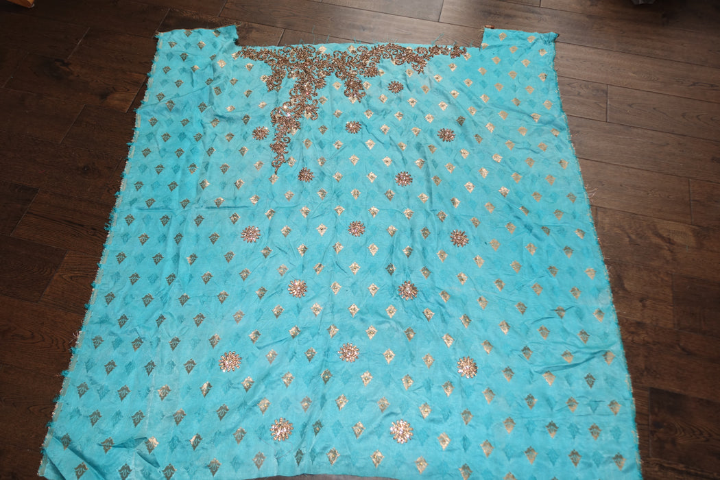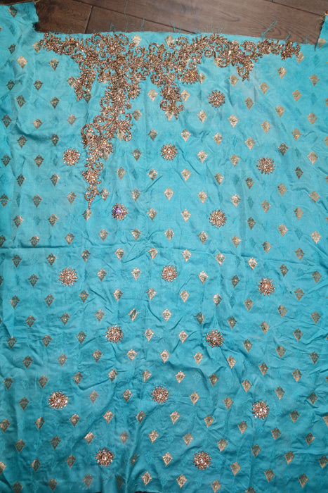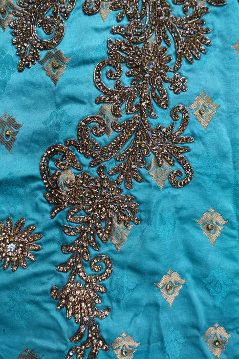Aqua blue soft silk banarsi, gold zari work with gold diamante stone design, The upper diamante bit is cut quite close to the stone work.