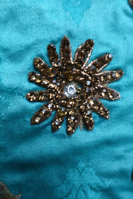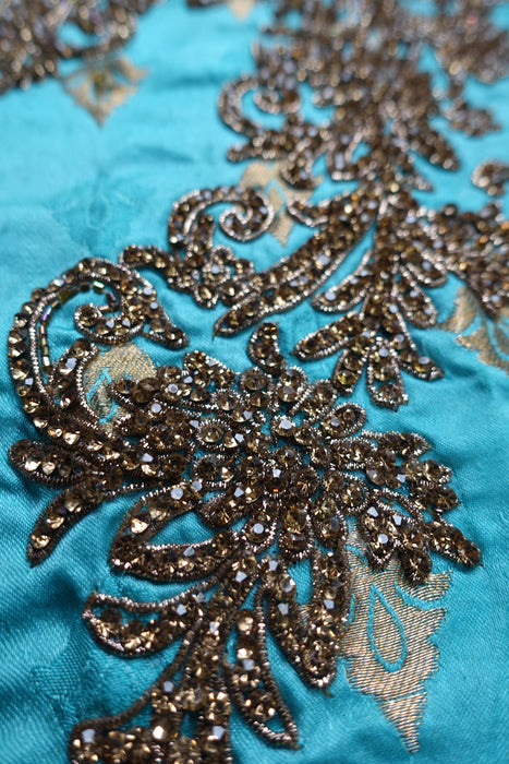 Aqua Blue Soft Silk With Gold Diamante Stonework Fabric