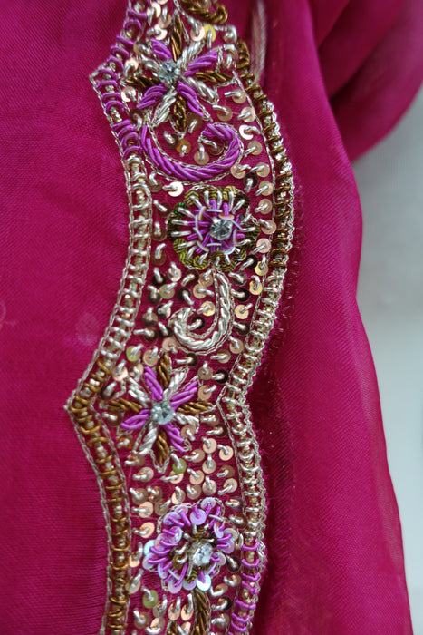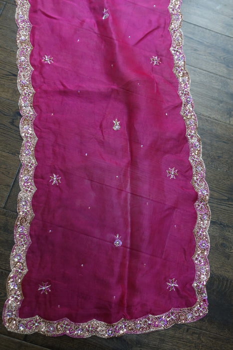 This is a silk organza dupatta, it is finished with a wide trim of beads, sequins and lots of gold zardosi work.