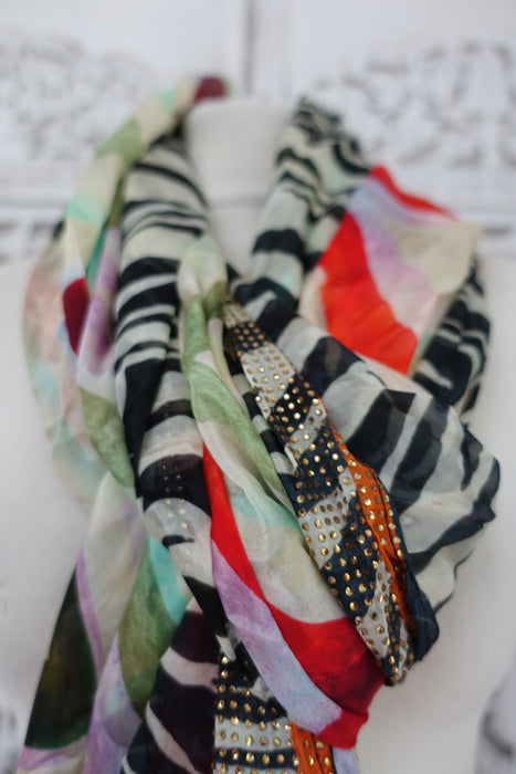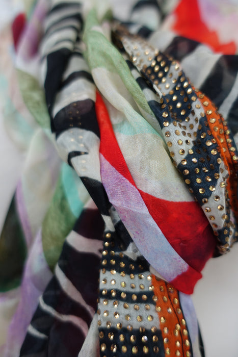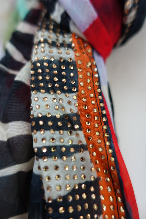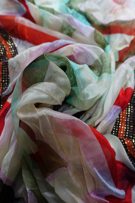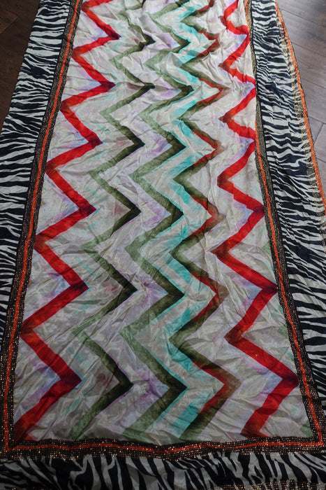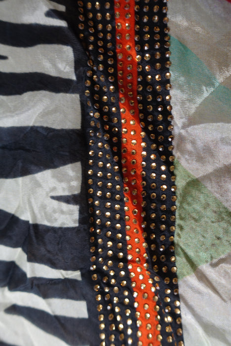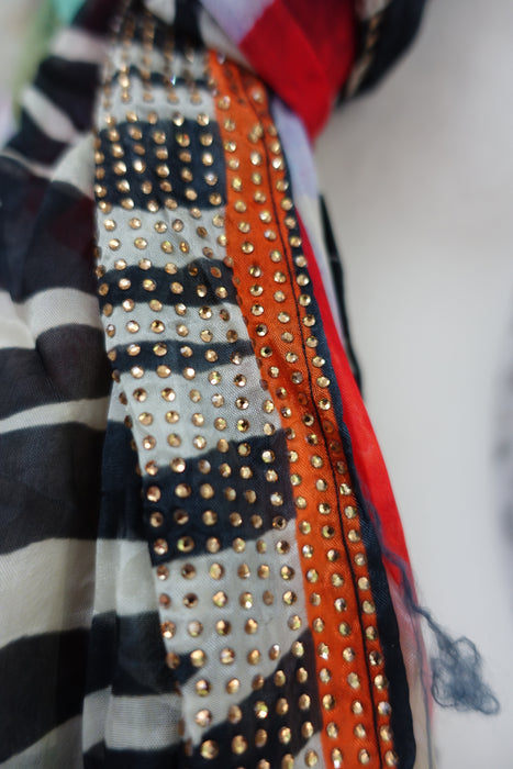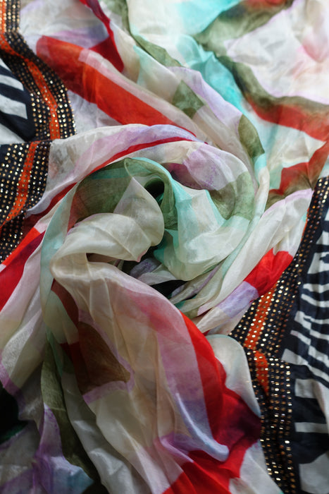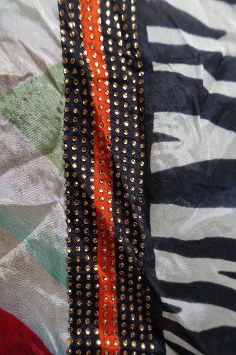 Description – this is a really silk vividly printed dupatta edges with rows of sparkling diamante stone work all around the outer edges.