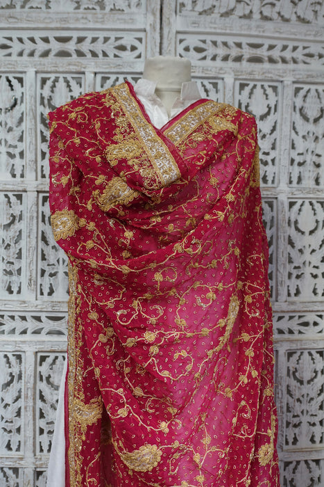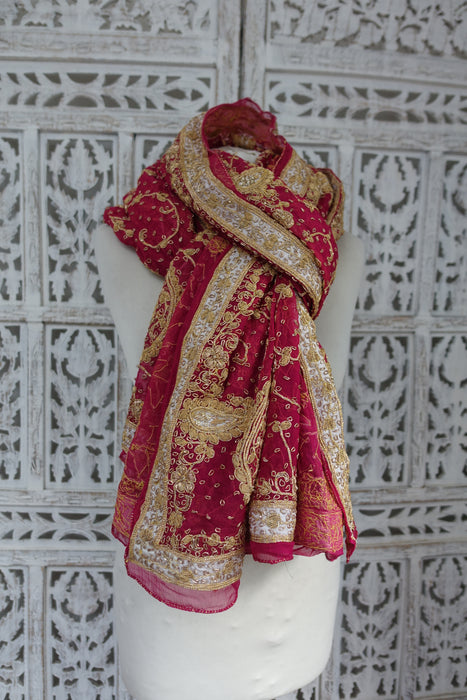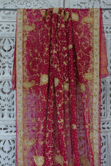 Raspberry Red Silk Chiffon Vintage Wedding Dupatta - New