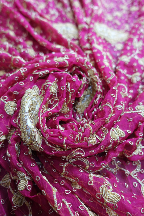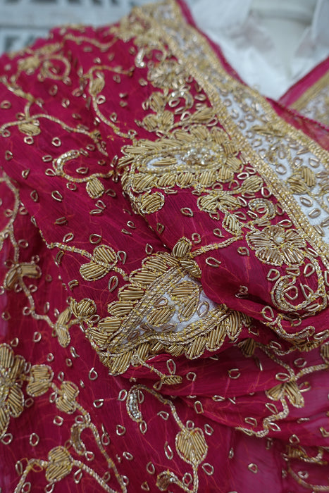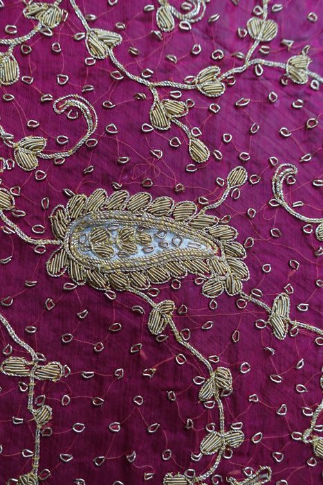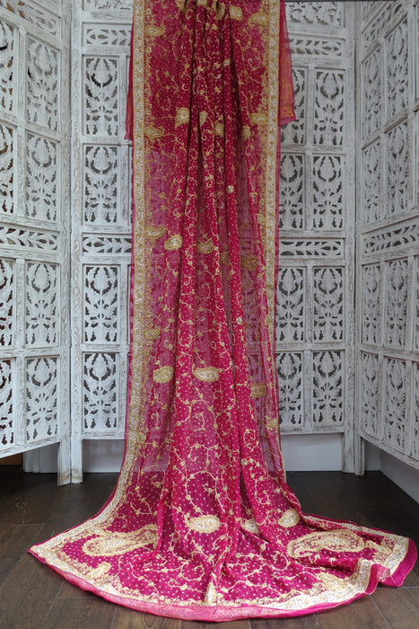 Description – this is a fabulous vintage wedding dupatta, it is more of a raspberry pink than hot pink. It has a wide applique around the outer edges and is embellished with masses of gold zardosi work, small pearl beading.