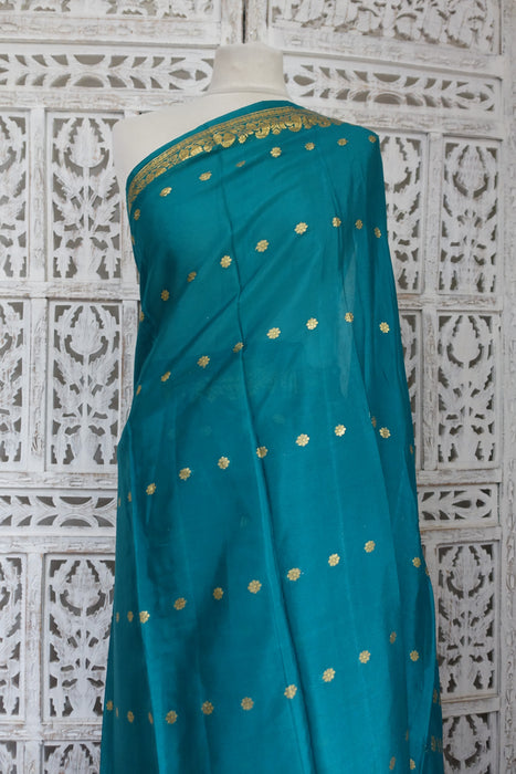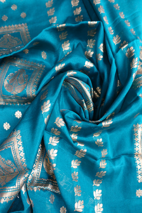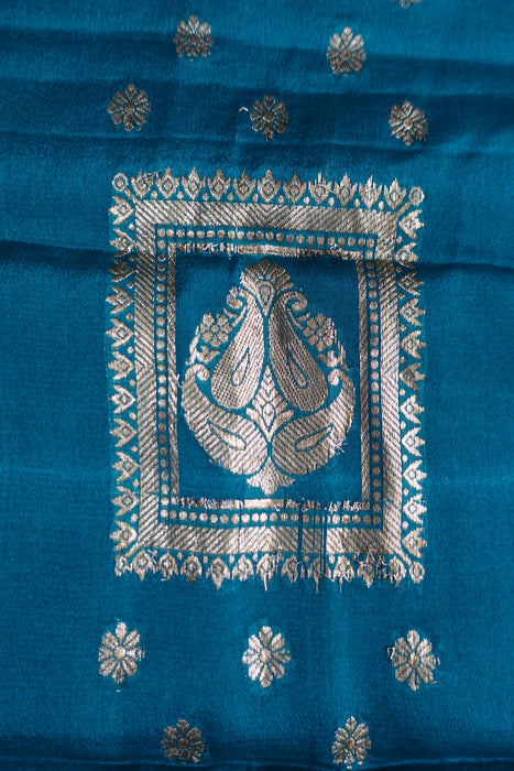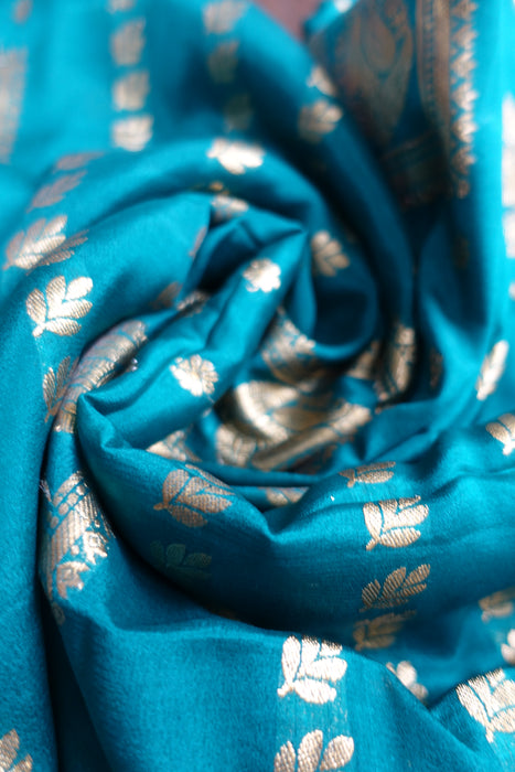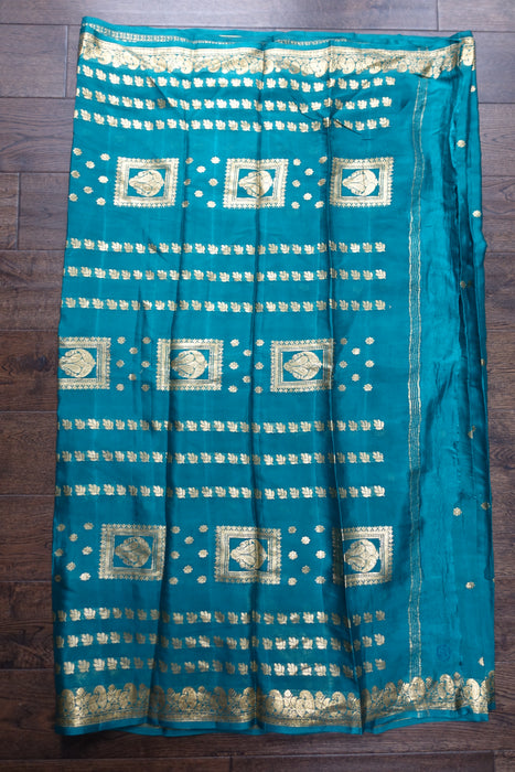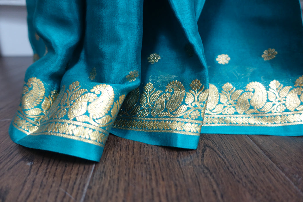 Description: A vibrant paisley design, woven in gleaming gold thread, adorns the hem and palla of this stunning sari.